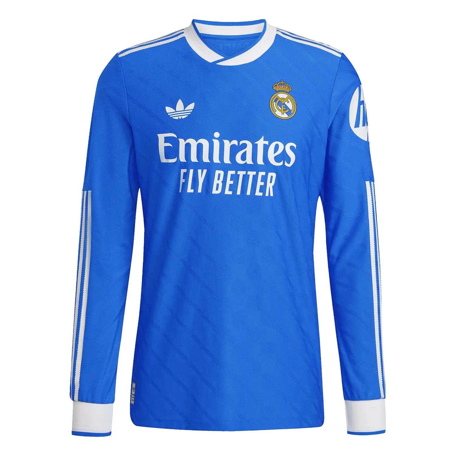 Bleu de chez bleu ! Ce maillot Third authentique Real Madrid se décline dans une teinte chère au cœur des plus grands fans du club et des 3 bandes. Idéal pour célébrer le partenariat du siècle, le coloris classique signé adidas Originals est un clin d'œil discret à l'identité de Bernabéu. Les 3 bandes dentelées et le trèfle confèrent un héritage adidas supplémentaire. Une construction axée sur la performance pour te sentir à l'aise sur le terrain.